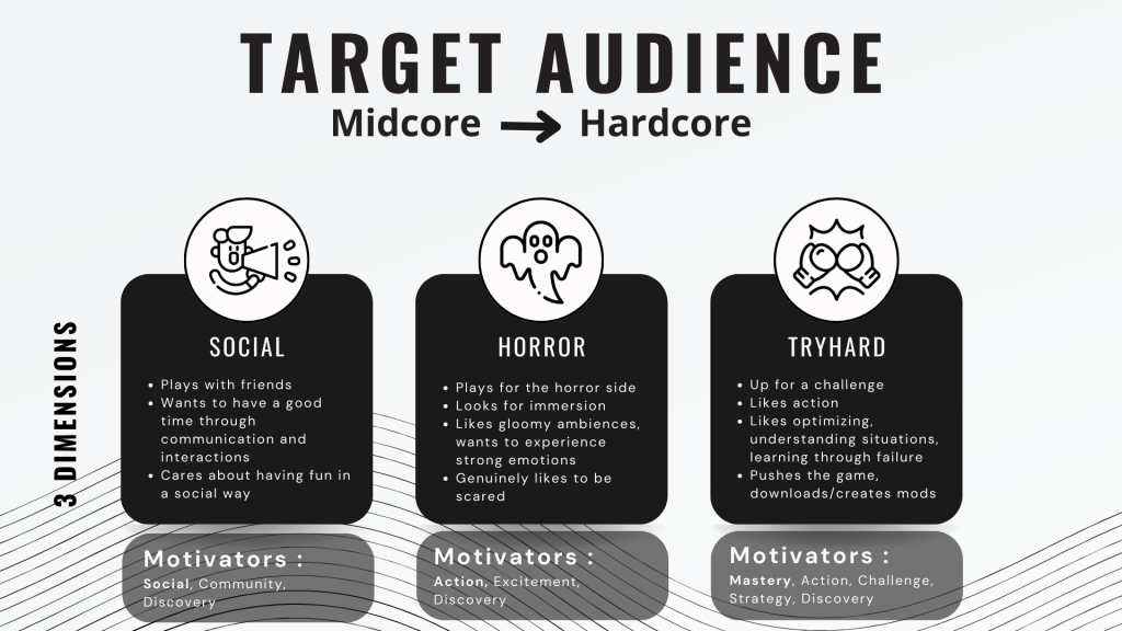 You might want to check out the whole process that led me to determine the target audience as it is. Click on the button below to access a document containing all the work I've done on it and that I've presented to the team. I end the document with open questions for me and game designers to answer during production as a whole.