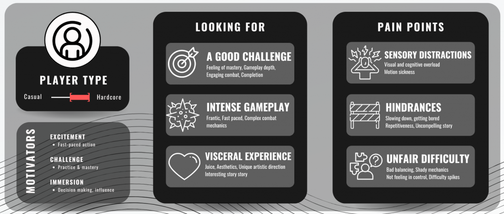 As a User Researcher, I was tasked to determine who our audience might be. We determined with the team games with an experience close to the one we want to create with Viscera and I reviewed hundreds of steam reviews to thouroughly understand what players did or did not like in these games. I used this massive amount of data and classified it methodically, until I came up with the profile above.